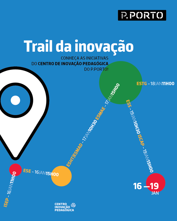 O Centro de Inovação Pedagógica (CIP) do P.Porto pretende dar a conhecer as suas iniciativas junto da comunidade académica de cada uma das suas escolas. Nesse sentido, o Trail da Inovação promove a divulgação de alguns projetos já em curso e de outros que estão a ser pensados e criados.