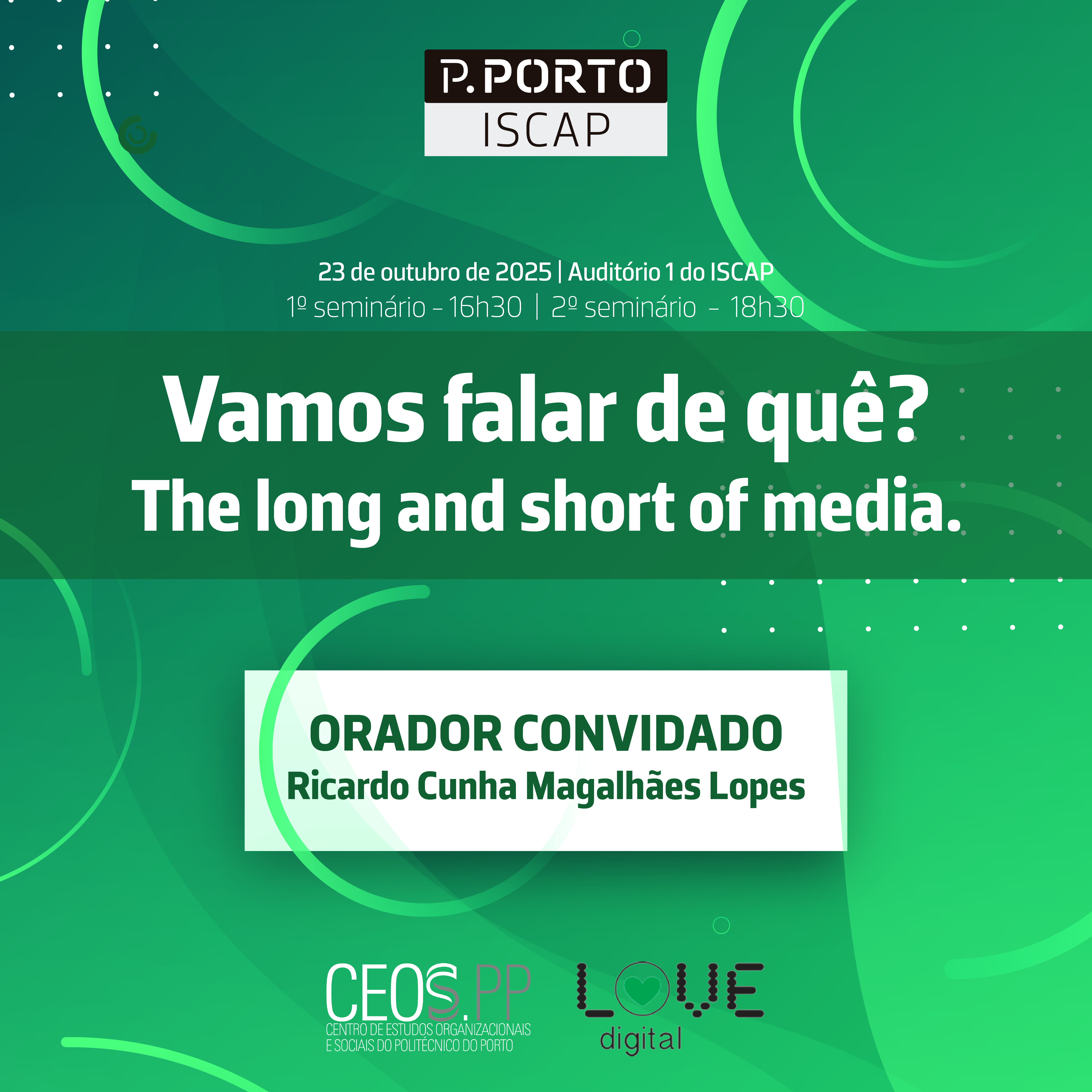 No próximo dia 23 de outubro de 2025, no Auditório 1 do ISCAP, vão decorrer duas sessões (às 16h30 e outra às 18h30) do seminário intitulado "Vamos falar de quê? The long and short of media", no âmbito do mestrado em Marketing Digital.