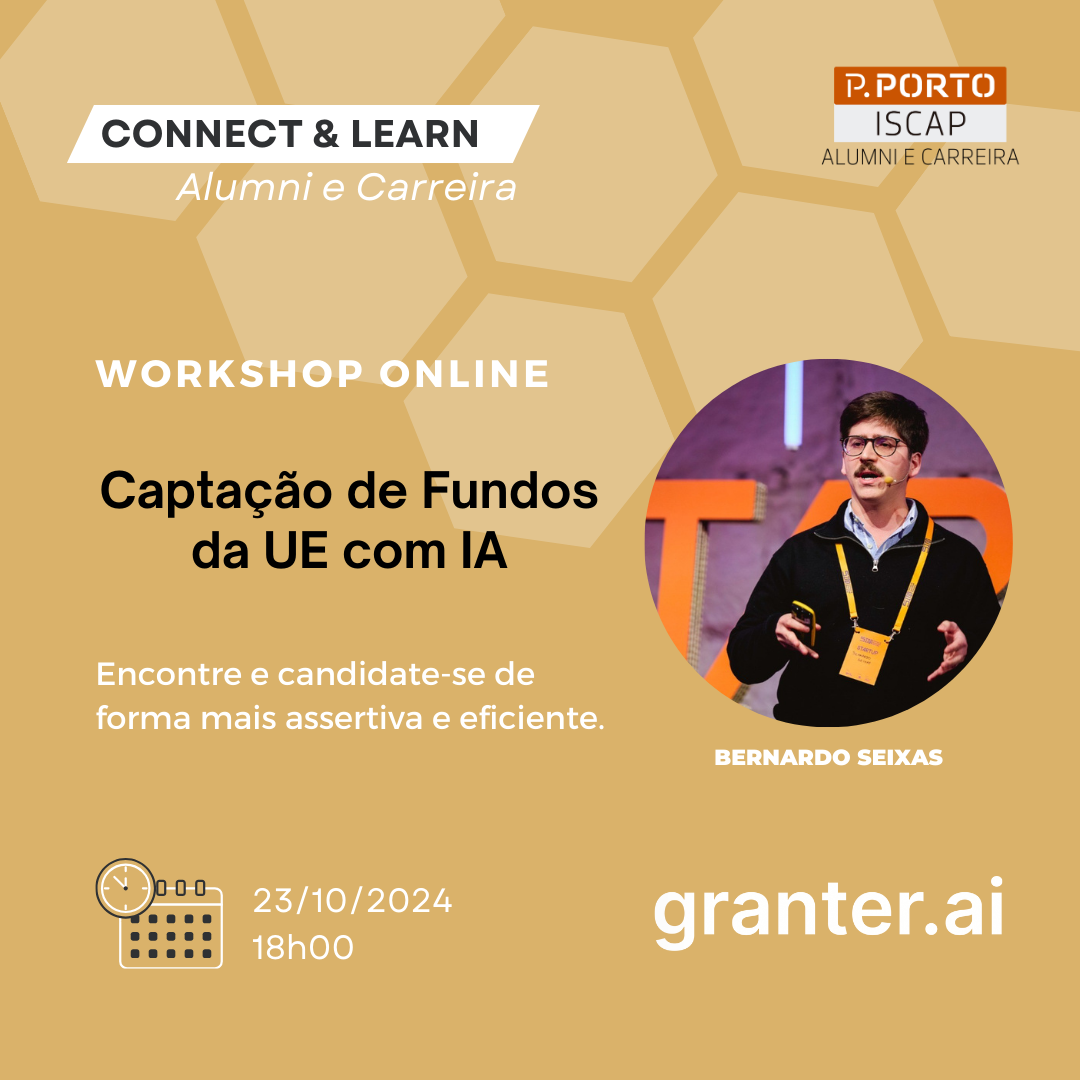 É com grande entusiasmo que anunciamos o próximo workshop do Programa Connect & Learn, organizado pelo Gabinete Alumni e Carreira do ISCAP. O tema desta sessão será Captação de Fundos da UE com IA, e decorrerá no dia 23 de outubro de 2024, às 18h (online).