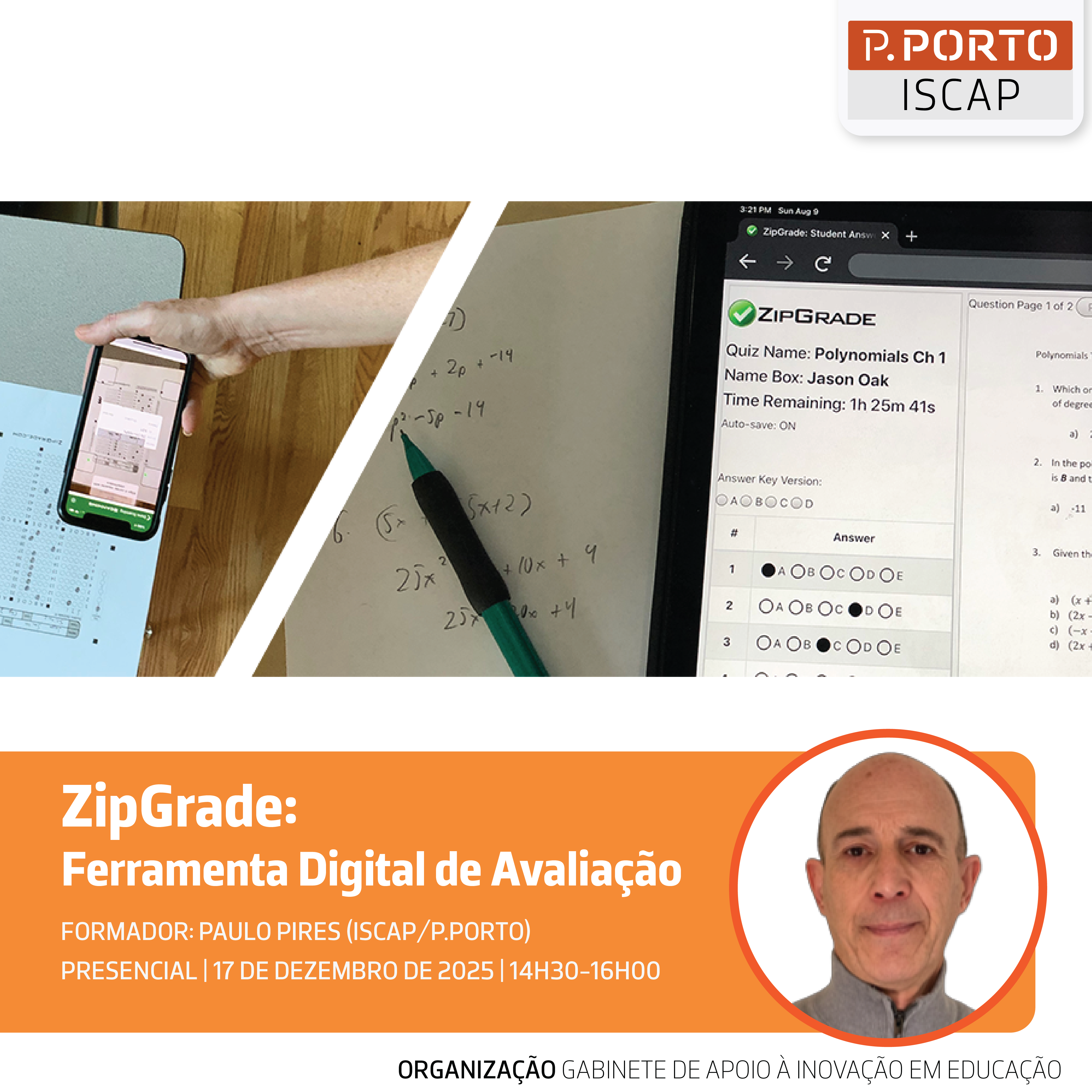 No próximo dia 17 de dezembro realiza-se a ação de formação “ZipGrade: Ferramenta Digital de Avaliação”, para os docentes do ISCAP. Esta ação de formação, ideal para quem procura uma alternativa aos teste eletrónicos de escolha múltipla, tendo como objetivo capacitar os formandos a utilizar o ZipGrade de forma autónoma e eficaz, desde a criação e digitalização de folhas de respostas até à análise dos resultados.